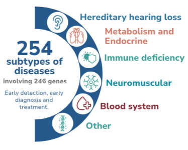 NOVA™ Newborn Genetic Screening Test determines a baby’s risk for 246 genes associated with 112 genetic diseases, including 254 disease subtypes including genetic metabolic diseases, deafness, immune deficiency diseases, Neuromuscular diseases (e.g. Duchenne Muscular Dystrophy, Spinal Muscular Atrophy etc.), and blood disorders such as thalassemia.